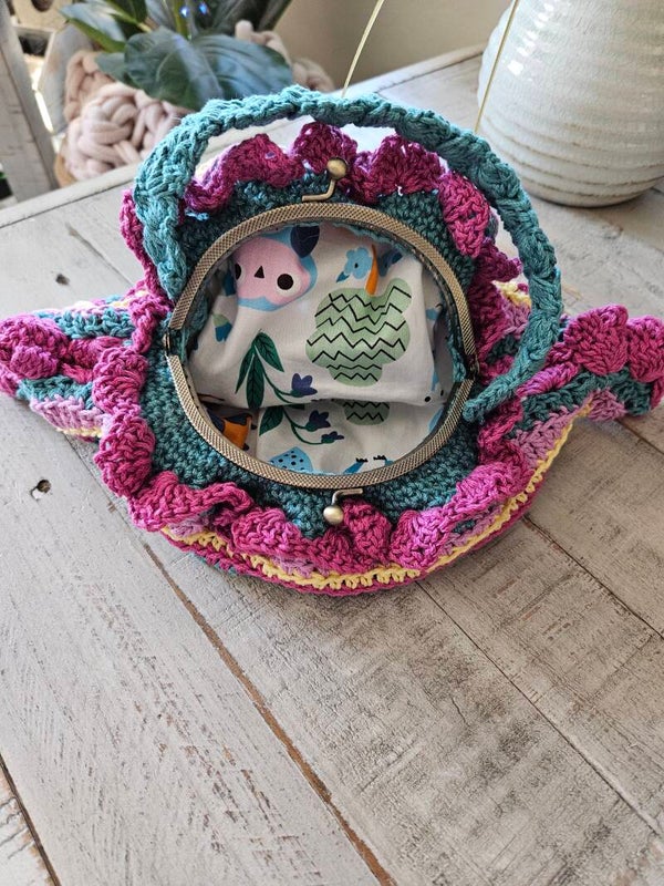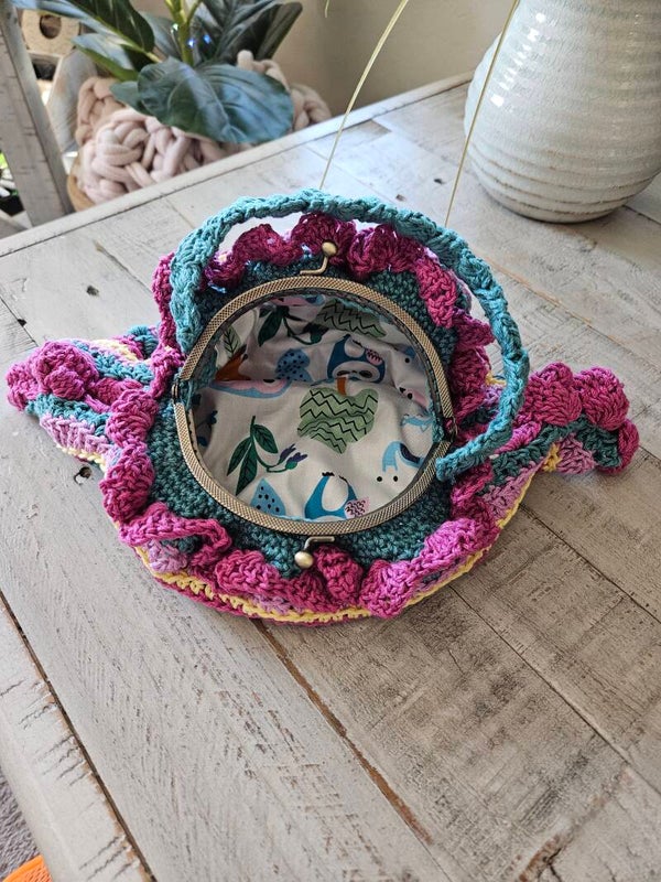 Hand crocheted with high-quality yarn for a one-of-a-kind texture and look. intricate stitches and a relaxed, slouchy shape. Perfect size for carrying the essentials: phone, wallet, keys, and lip balm. Broze kiss-clasp closure for secure and easy access. Soft, cotton lining for a touch of luxury.